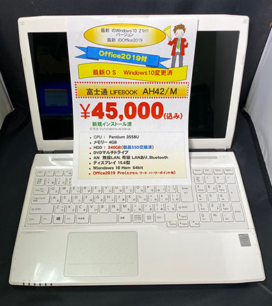 富士通 FMV AH42/M 基本仕様 ●OS: Windows 10 Pro 64bit ●CPU: Pentium 3558U ●メモリ: 4.00GB ●ストレージ: 高速SSDGB 240GB ●DVD: スーパーマルチドライブ ●ディスプレイ: 15.6 ●解像度:1366×768 付 属 品 ●電源コード ソフト : Office2019 Pro インストール済(認証済)